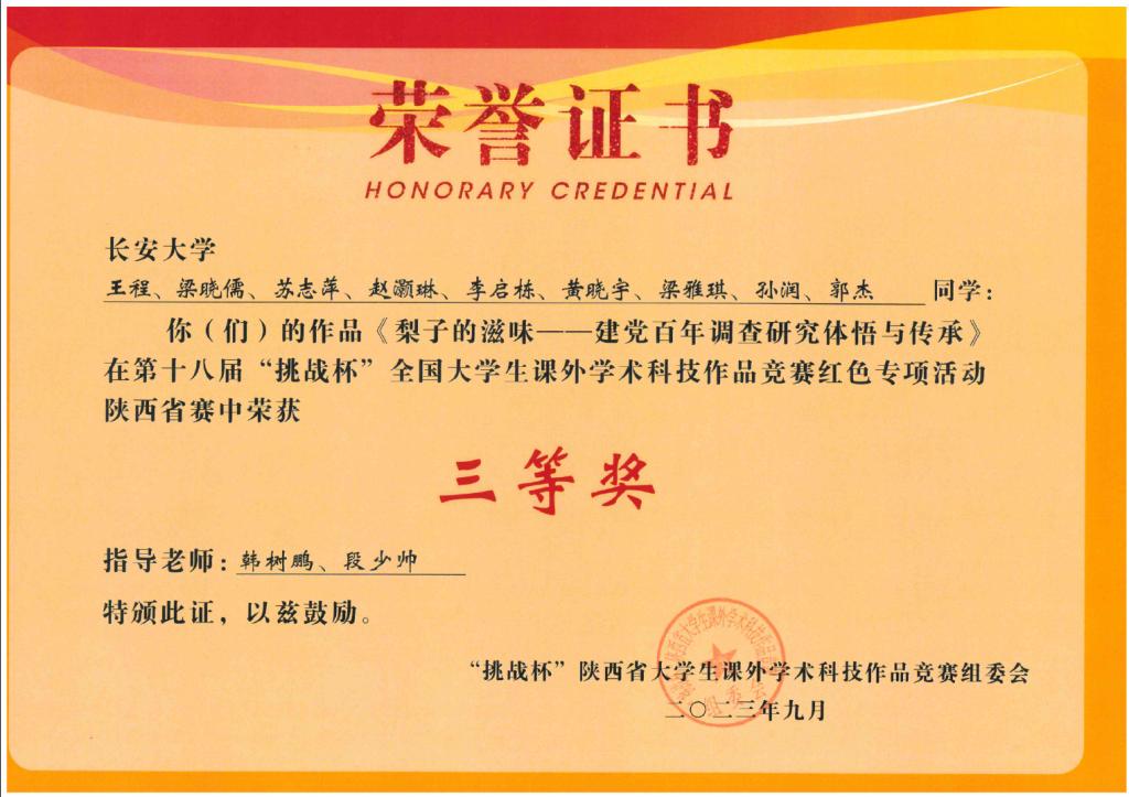参赛作品《“爱国、求实、奉献”——探寻地学精神赓续相传的新时代答案》和《梨子的滋味——建党百年调查研究体悟与传承》均获省级三等奖。在第十二届“挑战杯”陕汽集团陕西省大学生创业计划竞赛中,jojo漫画