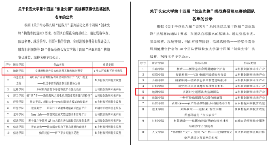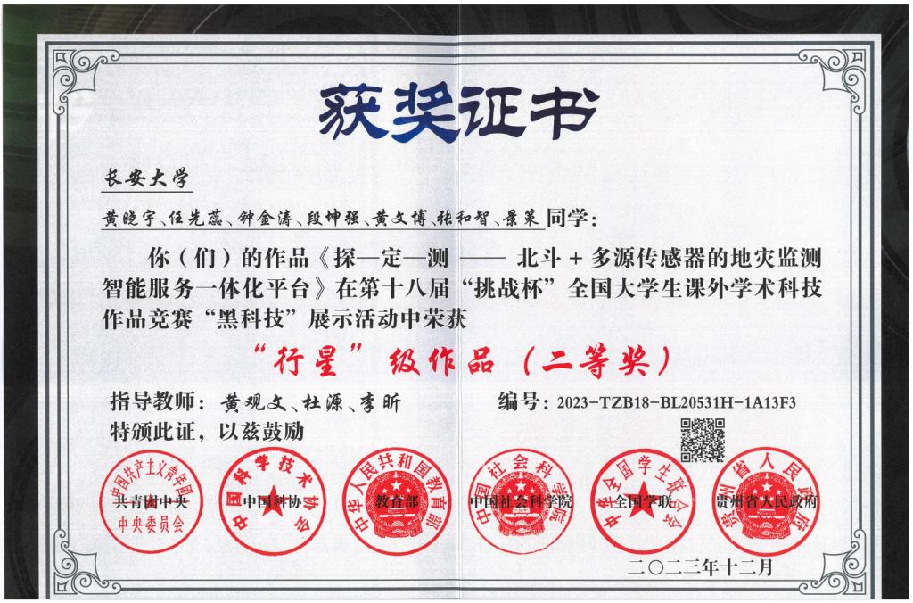 参赛作品《地灾侦察兵——北斗多源智能地灾监测预警平台》和《秦岭天眼—生态环境隐患识别与监测智能化系统》均获省级铜奖。