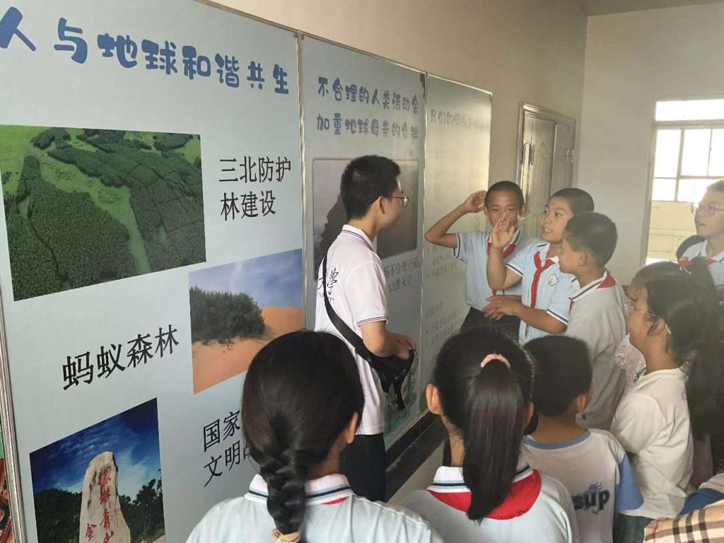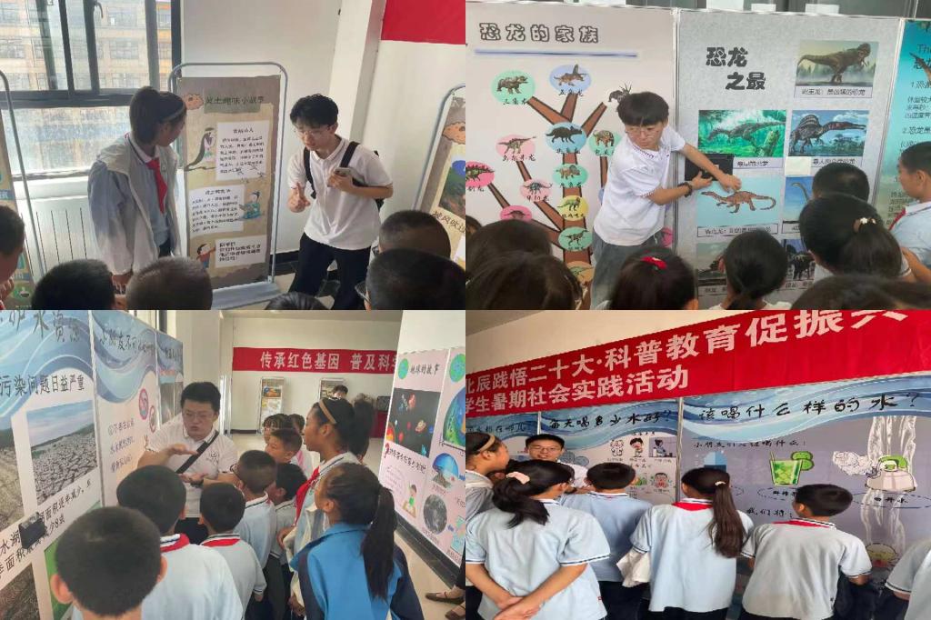 在五楼展厅外围走廊,师生们有序参观了围绕“认识地球”、“水的科普”和“黄土知识”三大主题的科学展板。这三个系列的展板由暑期社会实践队的5名队员担任讲解员,他们不仅详细解读了展板内容,还巧妙地设置了趣味小问题,以互动问答的形式激发同学们的学习兴趣。对于正确回答问题的同学,讲解员们还准备了小奖品以资鼓励,进一步提高了学生们的参与热情。