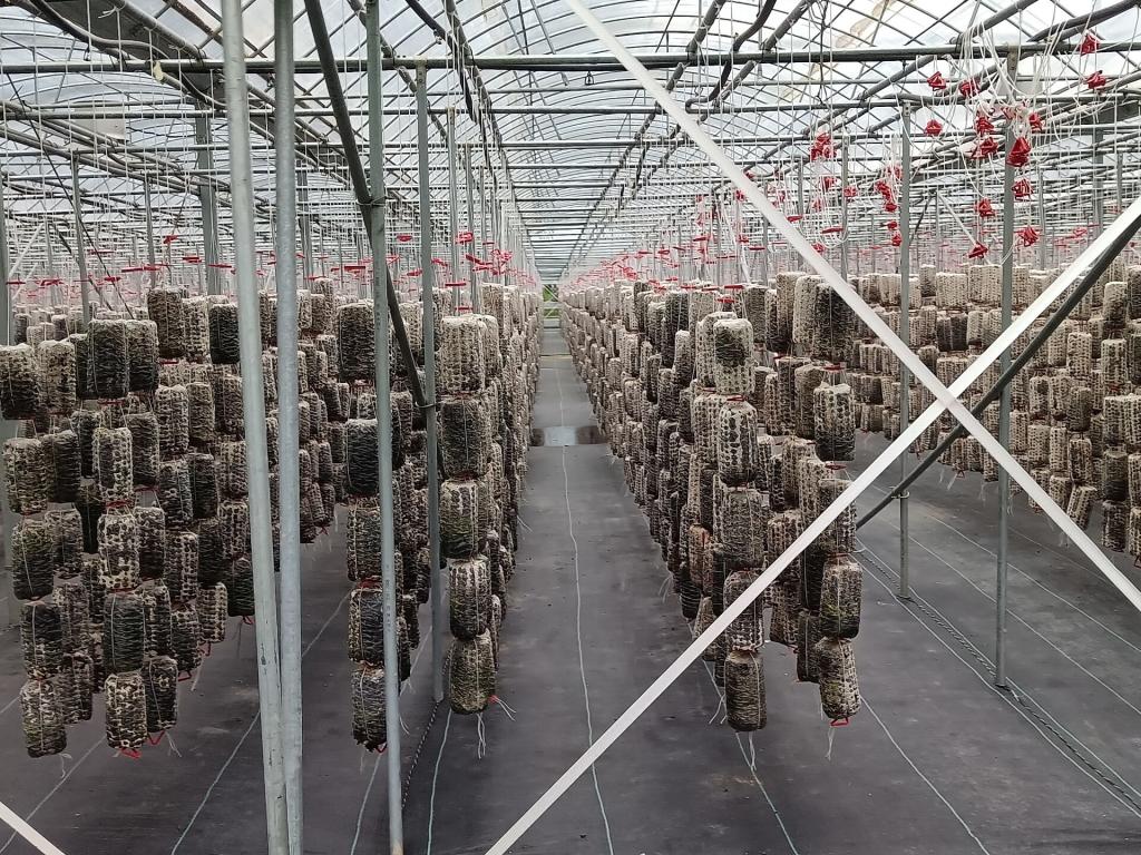 访谈结束后,实践队指导老师杨海城向程培培赠送了纪念品。随后,实践队一行在程培培的带领下,前往金米村的木耳种植基地进行实地参观。木耳大棚内部钢架上悬挂着上万个白色木耳菌袋,有些菌袋已经开始出耳,深黑褐色的耳面从菌袋刺孔处钻出,密密麻麻爬满了菌袋表面。大棚中间铺设了水泥路通道,便于管理和采摘。
