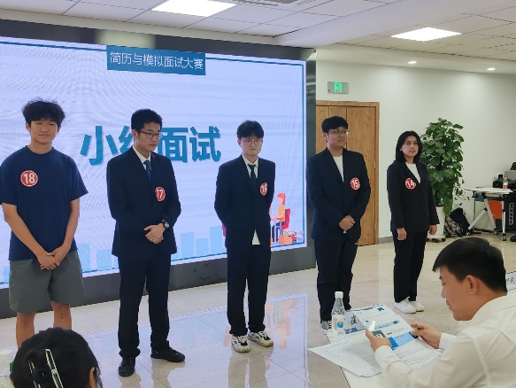 本次决赛分为两个部分:小组面试和无领导小组讨论。在小组面试环节,选手们分组上台,在一分钟时间内,从自身的教育经历、实习经验、求职意向等方面进行自我介绍,评委们则针对选手的简历和自我介绍情况,从专业知识、价值取向、困难应对等方面对选手提出问题,由选手现场作答。在无领导小组讨论环节,选手们在给定的30分钟时间内,根据题目展开讨论,最后按题目要求进行解答汇报。在无领导小组讨论中,参赛选手踊跃参与,各抒己见,勇敢表达自己的观点和想法,经过充分的讨论和酝酿,最终达成共识,向评委团进行汇报。