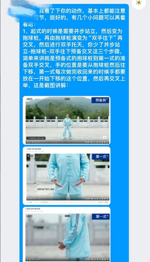 同时,为了在训练休息期间巩固动作练习成果,特别在训练群建立视频学习相册,安排同学们在宿舍中对照详细分解动作进行学习,并录制视频上传。基于同学们的视频学习情况,史老师针对性为同学们提供动作指导意见,有效提升同学们的动作学习效果。