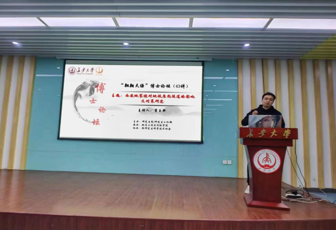 承办、校研究生科学技术协会协办的“翱翔天语”博士论坛43讲在南校区东院第一报告厅顺利举办。博士研究生苟玉轩作了题为“西安地裂缝对地铁盾构隧道的影响及对策研究”的报告,相关学院共70余名师生参加论坛。