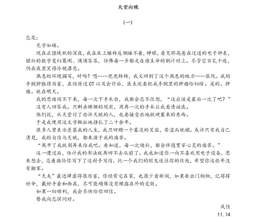 文学社第三届黑与白征文比赛全校一等奖(总分第一名),2023年6月,他的小说《天堂向晚》荣获jojo漫画
