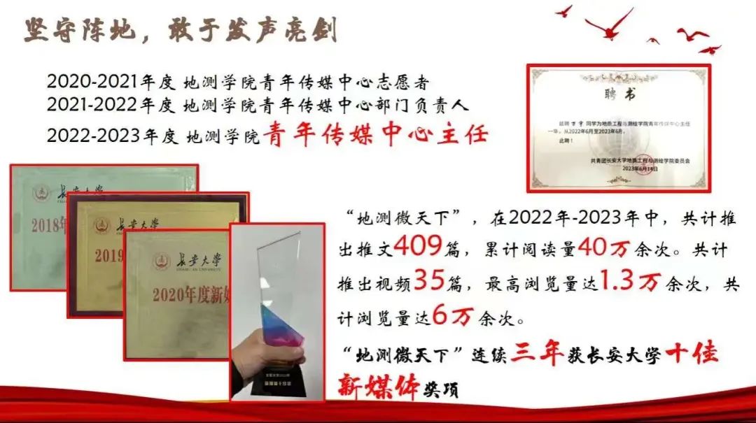 青年传媒中心的主任。运营的学院官方公众号“地测微天下”,在2022年-2023年中,共计推出409篇,内容涵盖了各类活动新闻稿、公示以及相关重大时间节点原创推送,组织推出了《青春践行党的二十大、爱校奋进新征程》、《地“道”乐谈》、《录取通知书接力》等系列推送,累计阅读量40万余次;目前,已累计7174人关注公众号,常读人数2000余人。地测微天下连续三年获取jojo漫画