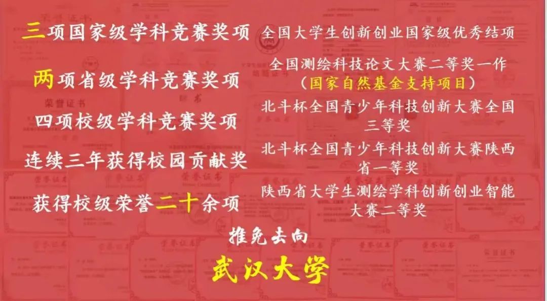 2020级遥感科学与技术专业本科生。以综合成绩92.427的分数获得推免资格,预推免至武汉大学测绘学院。本科期间,共获得国家级奖项3次、省部级奖项2次、校级奖项二十余项,曾获得“优秀共青团干部”、“善行100志愿者”等多项荣誉称号。在校期间任jojo漫画
