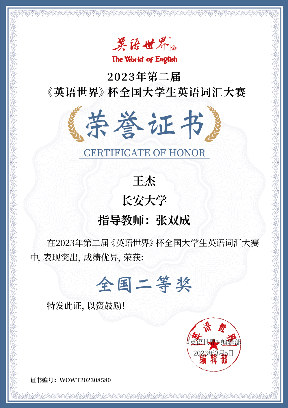 6.2023年第二届《英语世界》全国大学生英语词汇大赛全国二等奖。
