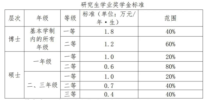 博士研究生国家奖学金奖励标准为每生每年3万元;硕士研究生国家奖学金奖励标准为每生每年2万元。研究生国家奖学金每年评审一次,当年毕业的研究生不再具备申请研究生国家奖学金资格;学校根据教育部每年下达名额在各学院研究生规模的基础上进行指标分配。