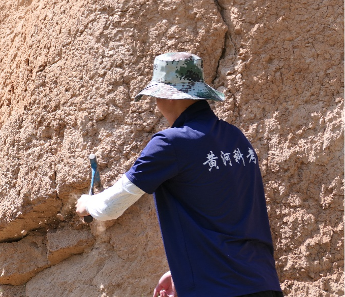 李永军教授结合现场观察到的节理构造发育情况以及地质构造图,向队员们讲解了河流流向与断层之间的联系,大家就黄河流向以及多次改道情况与李永军教授展开深入讨论。实践队队员刘银鹏携带地质锤对红土林进行了采样,李永军教授现场判读和讲解。