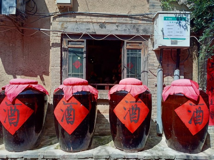 酒味飘香,循着酒味实践队来到酒坊。袁家老窖内到处都是酒坛子,上面用一小块红纸写着“礼泉醇”、“十里香”和“女儿红”。酒窖在院内的二层小楼的地下室,灯光昏暗,几十大缸子的酒糟,在阴湿的底下默默地发酵,最后经过蒸馏而形成醇美的酒浆。
