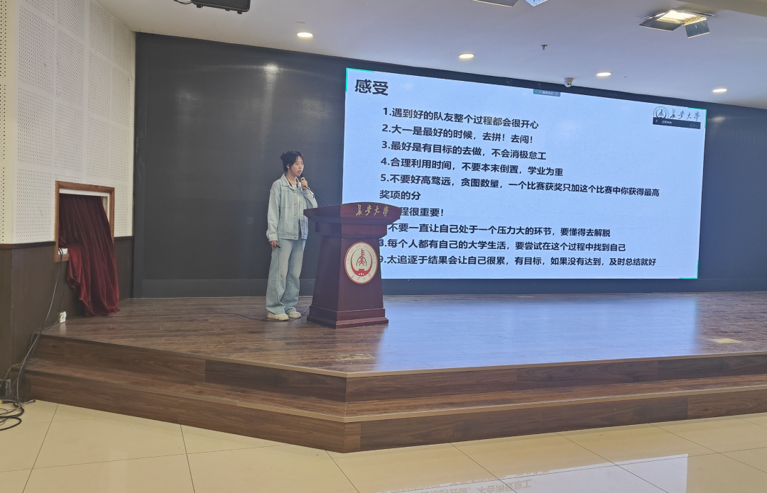 科创竞赛体系、重要赛事进程及参赛心得分享展开宣讲,首先对各大赛事进行了详致的介绍,并结合自己的竞赛经历对各项赛事作经验分享,接下来从个人素质、团队协作、学术能力、心理调节四个方面向同学们分享了自己独到的心得,最后以“科创先行,强国有我”八个字收场,给予同学们殷切的鼓励。