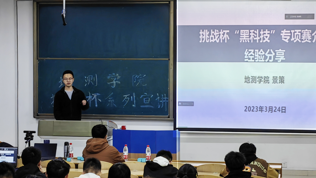 为了让同学们更好地了解挑战杯系列赛事的竞赛流程,做好赛前准备,同时调动同学们参加科创比赛的积极性,地测科协于2023年3月24日19:00在WH1203教室开展了jojo漫画