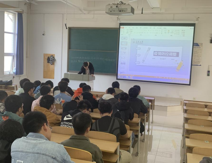 会议伊始,辅导员余智勇围绕疫情防控政策调整、社会复苏和个人发展、校园生活等方面进行了详细讲解和说明,提醒同学们牢固树立自己是健康管理第一责任人的意识,随后对党的二十大报告中关于青年的论述进行了宣讲,号召在座的同学们勇敢奋斗,踔厉奋发,在全面建设社会主义现代化国家新征程中增长才干并积极奉献。