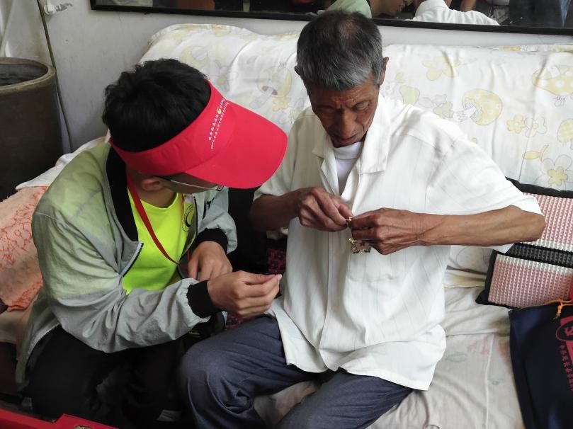 实践队员为白生荣老人佩戴勋章