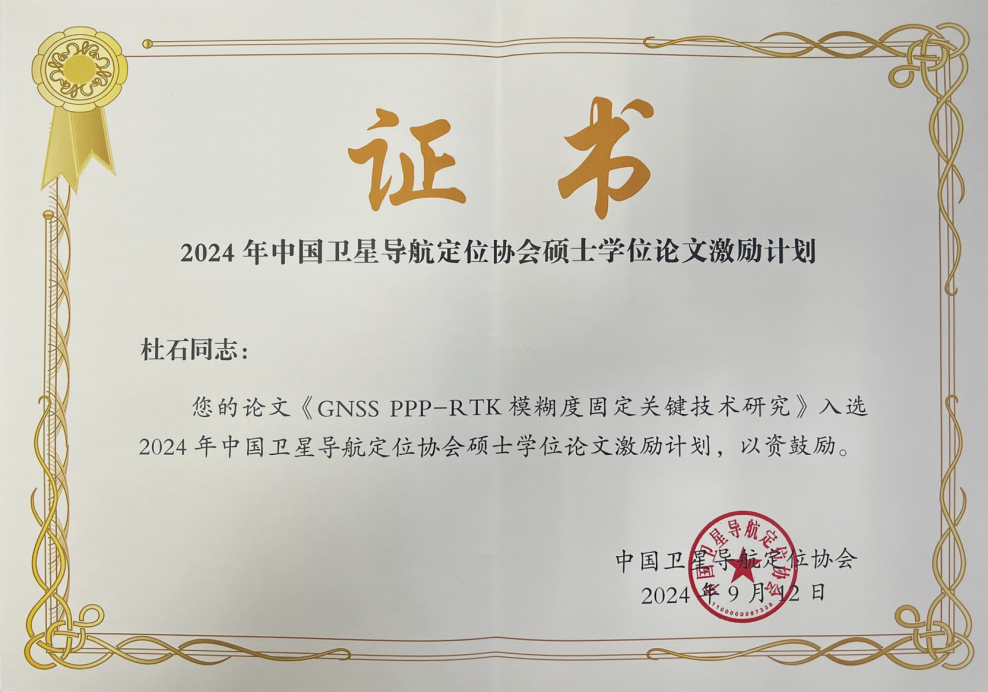 近日,经学位论文评审委员会终评,2024年度中国卫星导航定位协会论文激励计划评选结果出炉,本年度全国共评选出10篇优秀硕士学位论文,我校2022届硕士研究生杜石的学位论文《GNSS PPP-RTK模糊度固定关键技术研究》成功入选2024年度中国卫星导航定位协会硕士学位论文激励计划,指导老师为黄观文教授。