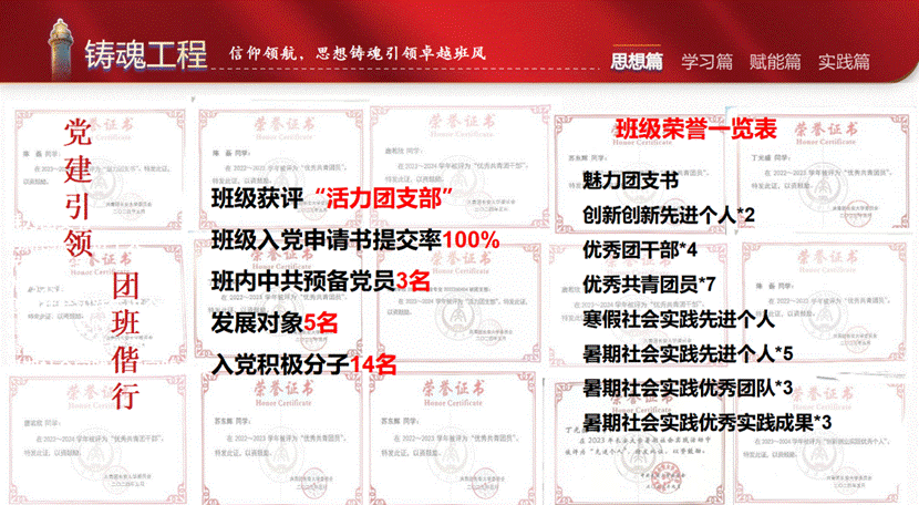班级积极响应党的号召,推动实施“时代新人铸魂工程”,将思想建设放在首位。班级成员入党申请书提交率100%,班内现有中共预备党员3人,接受党课培训19人,获评为“活力团支部”。