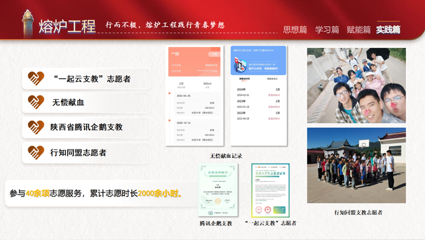 班级成员积极参与校园建设,班级成员中有25人曾加入各级学生组织,参与率达全院之首。全班共计参与40余项志愿服务,班级成员所参与志愿项目累计志愿服务时长2000余小时。大家在提升自身实践能力的同时扛起青年人的责任,激励更多同学积极参与志愿服务,以小我共筑青春之大我。