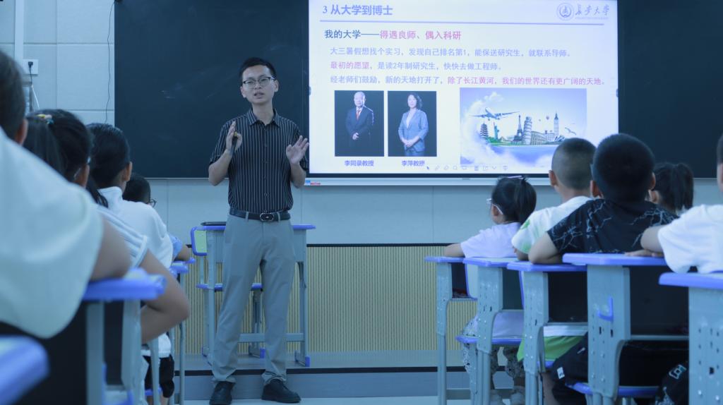 沈伟副教授面向四年级全体学生,以《我的求学之路》为题,分享自己25年的个人成长故事与求学心得。“Where there is a will,there is a way”(有志者,事竟成)沈老师朴实的话语在孩子们心中播下探索科学的种子。