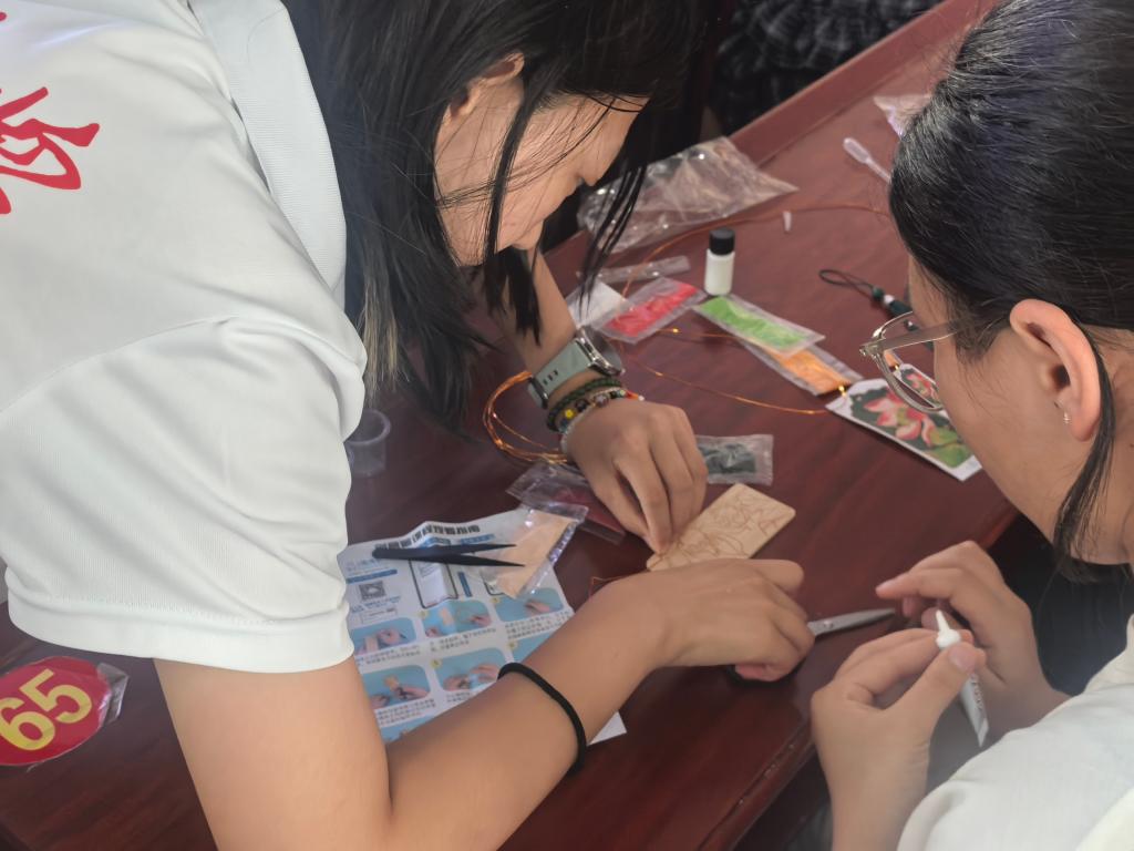 实践过程中,实践队员分组指导学生操作。掐丝环节,悉心指导力度与角度控制、固定方法及胶水用量;着色环节,重点讲解分层铺砂技巧、均匀分布与边界控制,及时纠正填砂过满或厚度不均问题。面对复杂图案,队员们耐心指导细节处理,确保每位同学都能完成作品。