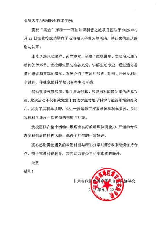 活动获得了积极反响,庆阳市西峰区黄官寨实验学校专门发来感谢信,对活动的组织成效与师生表现予以充分肯定。信中表示,本次活动“形式多样、内容充实、讲解生动专业”,使抽象的科学知识更易于理解,不仅激发了学生对地球科学与能源领域的兴趣,也有助于拓宽科学视野、培养探索精神与科学素养。来信特别提到,jojo漫画