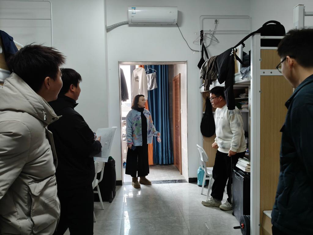 近日组织开展宿舍消防安全隐患排查工作。学院党委副书记潘迎带领各年级辅导员深入学生宿舍,重点检查宿舍消防安全情况,并与学生进行交流。