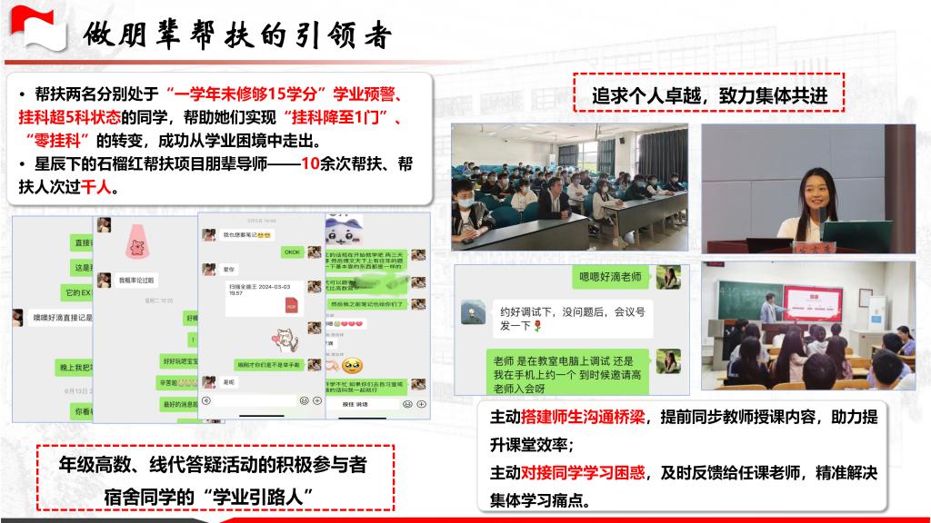 作为中共党员,她在深耕专业知识的同时,始终保持理论学习的自觉:主动研学党的创新理论,系统梳理理论要点与实践案例,凭借扎实的理论储备加入星火宣讲团,为后续开展思想宣讲筑牢理论根基。她更将“求真”精神延伸至集体成长。