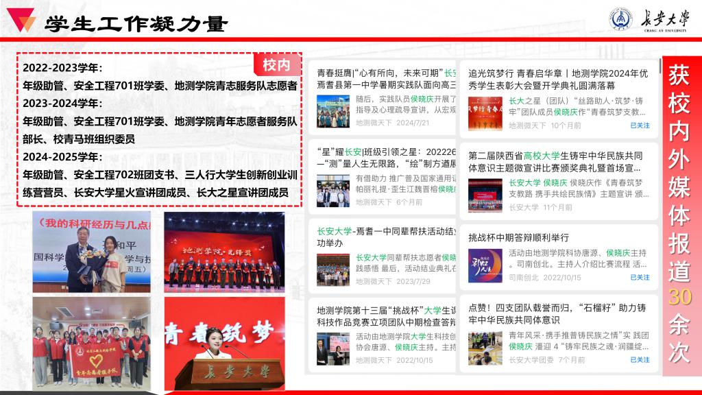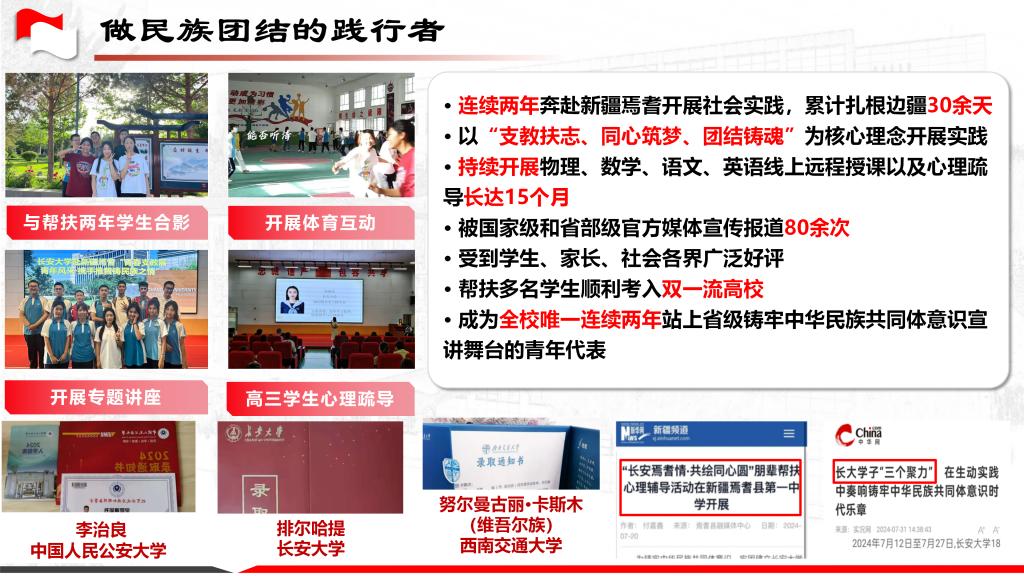 星火宣讲团成员,陕西省铸牢中华民族共同体意宣讲团成员,西北高校青年铸牢中华民族共同体意识宣讲联盟代表。连续三年专业和综合成绩排名双第一,获得国家奖学金、感恩中国近现代科学家奖学金等,现已推免至中国科学技术大学;连续两年赴新疆焉耆开展铸牢中华民族共同体意识社会实践,社会实践时长累计30余天,实践活动被国家级和省部级官方媒体宣传报道80余次,注重凝练总结,将实践案例结合党的创新理论进行宣讲,获得西北高校青年师生铸牢中华民族共同体意识主题演讲比赛三等奖、jojo漫画