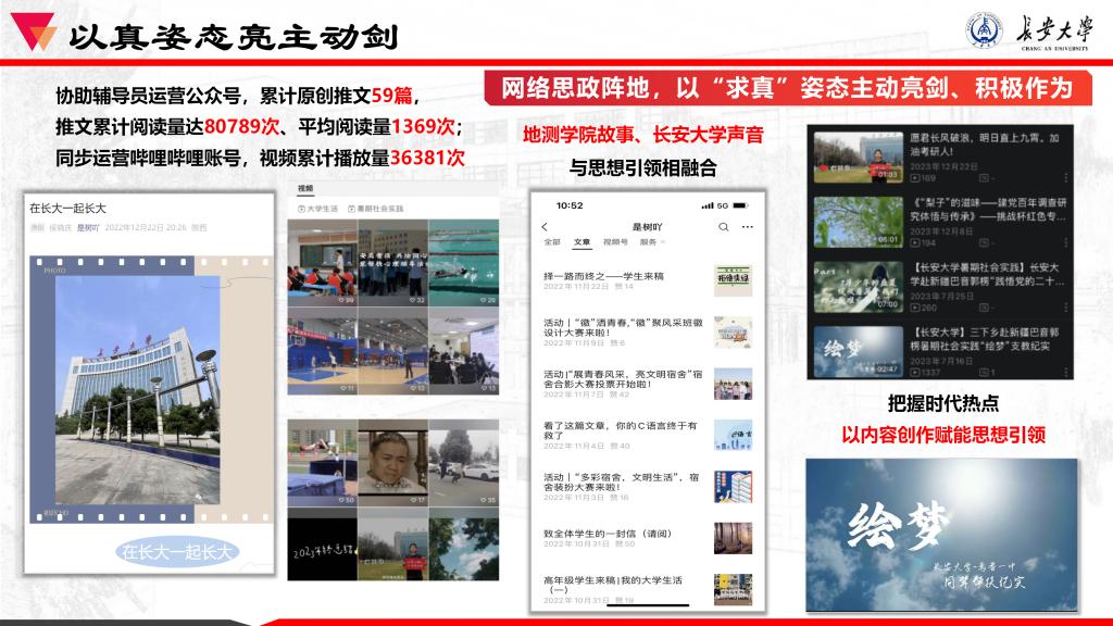 在网络思政阵地,她同样以“求真”姿态主动亮剑、积极作为。牵头运营公众号期间,她主动把握时代热点,以内容创作赋能思想引领,在清朗网络空间、壮大主流舆论中贡献青春力量。