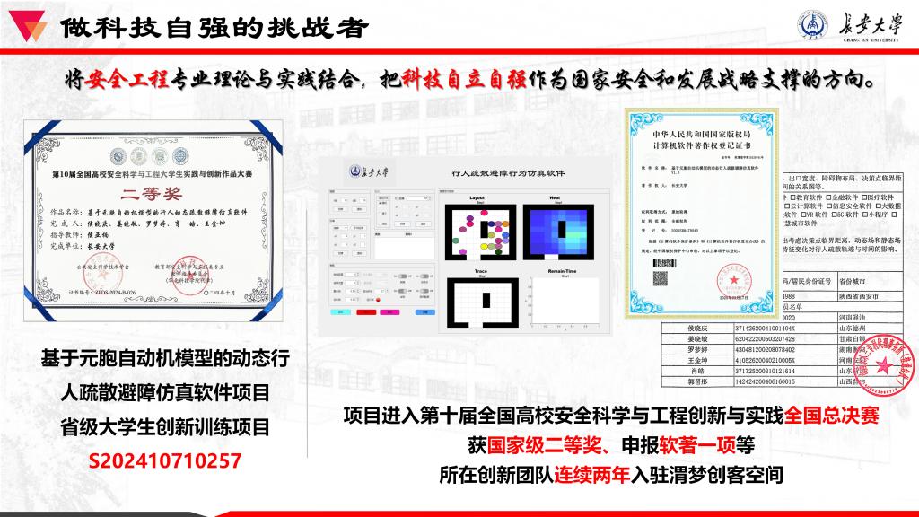 科创方面,她始终将科技创新与国家战略需求紧密结合。在3学年的学习中,作为负责人主持中央高校子计划研究课题1项,参加3项;主持校级大学生创新创业项目1项;主持省级大学生创新创业项目1项,参加2项;三人行大学生创新创业训练营资助1项;此外,她积极参加学科专业竞赛和各类活动,曾作为第三负责人获第九届安全科学与工程大学生创新实践与作品大赛国家级三等奖,作为负责人获第十届安全科学与工程大学生创新实践与作品大赛国家级二等奖,作为负责人获全国三维数字化设计与制造大赛省级一等奖,完成论文两篇。