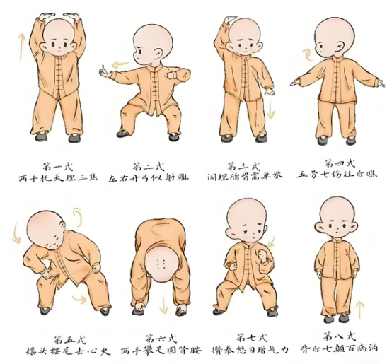 关于八段锦:八段锦功法是一套独立而完整的健身功法,起源于北宋,共八百多年的历史。现代的八段锦在内容与名称上均有所改变,此功法分为八段,每段一个动作,锦者,誉其似锦之柔和优美,也可理解为单个导引术式的汇集,如丝锦那样连绵不断,是一套完整的健身方法,故名为“八段锦”。练习无需器械,不受场地局限,简单易学,节省时间,适合于男女老少,长期练习,健身健心,亦可改善亚健康状态。