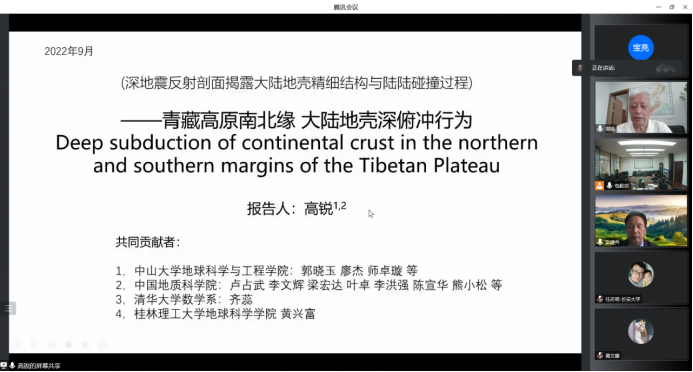 首先,高院士指出青藏高原的是打开地球科学奥秘的金钥匙,而深部探测中深反射地震是探测大陆深部结构的先锋技术,具有高精度和高分辨率的特点,能够追踪揭示地球深部构造演化行为。报告介绍了国际和国内在深地震反射方面的研究进展,并着重介绍了所在团队的重大科研成果,介绍了我国深部探测岩石圈团队近30年来完成的16500km长度深地震反射剖面的情况,其中青藏高原超过了4000km。高院士以全炮集偏移时间剖面解释为基础,揭示了青藏高原精细的地壳结构和陆内造山过程,深刻讲述了印度与亚洲的陆陆碰撞及深俯冲行为,给出了青藏高原北部多次南向陆内俯冲与北东向扩张演化模型。