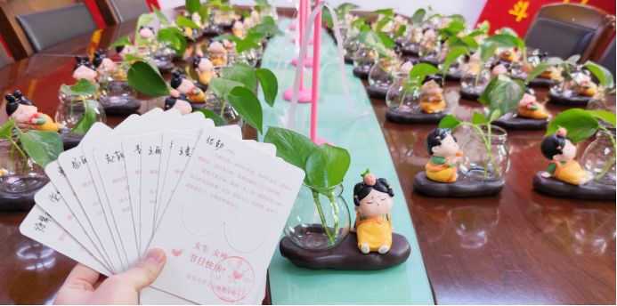 响应学校“巾帼言志——我们的新征程”系列活动的号召,专门组织主题为“所愿成真 浪漫一生”的特色庆祝活动,活动以“分散集中、线上线下”相结合的方式为女教职工发放了创意桌面水培小摆件并配以手写贺卡、贺卡祝词等节日礼物。祝词中感谢了学院女教职工为校、院发展做出的贡献,并重申女性的重要地位,呼吁女教职工重视自身身心健康发展。活动充满创意,营造浪漫温馨的氛围,获得大家的一致好评。