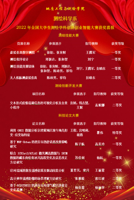 测绘科学系师生通过参与各类竞赛,促进了学生知识、能力、素质的协调发展,践行了以学生为中心、因材施教、个性培养的育人理念,达到了以赛促学、以赛促教、以赛促改的目的。