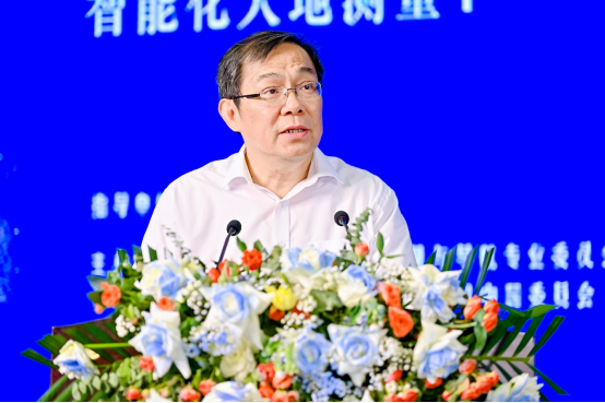 陕西省测绘地理信息局局长徐开明致辞,他强调了测绘地理信息工作在社会服务、数字经济中的重要作用,阐述了大地测量学科广阔的发展前景。
