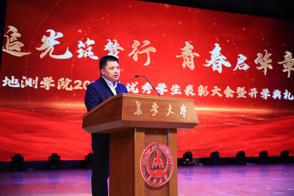 学院院长李振洪首先致辞,他代表学院全体师生对2024级全体新同学表示热烈的欢迎,同时对同学们提出了期望和要求:一是学习身边榜样,在学习中不断用知识完善自我,顺应时代大局,立鸿鹄之志,做挺膺担当奋斗者。二是以热爱为本,守初心之约,在专业学习中强化本领和担当,将个人梦想与强国使命相连,心怀家国,做民族复兴贡献者。三是以创新为帆,踏时代之浪,系统学习、锚定需求,青年学生更要勇于探索,读好“有字”“无字”之书,做全面发展“地测人”。