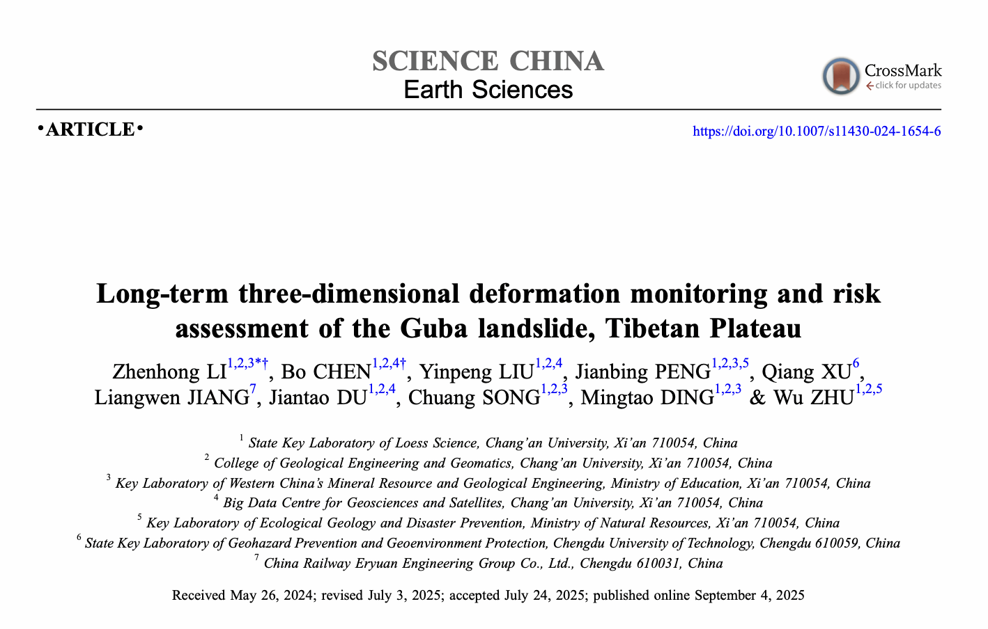 李振洪教授团队与成都理工大学许强教授、中铁二院蒋良文副总工程师合作,在人迹罕至高位远程滑坡长时序三维监测和风险评估方面取得新进展。相关研究成果以“青藏高原古巴滑坡长时序三维形变监测和风险评估”为题,于2025年9月3日发表于《中国科学:地球科学》(Science China Earth Sciences)杂志,通讯作者为jojo漫画