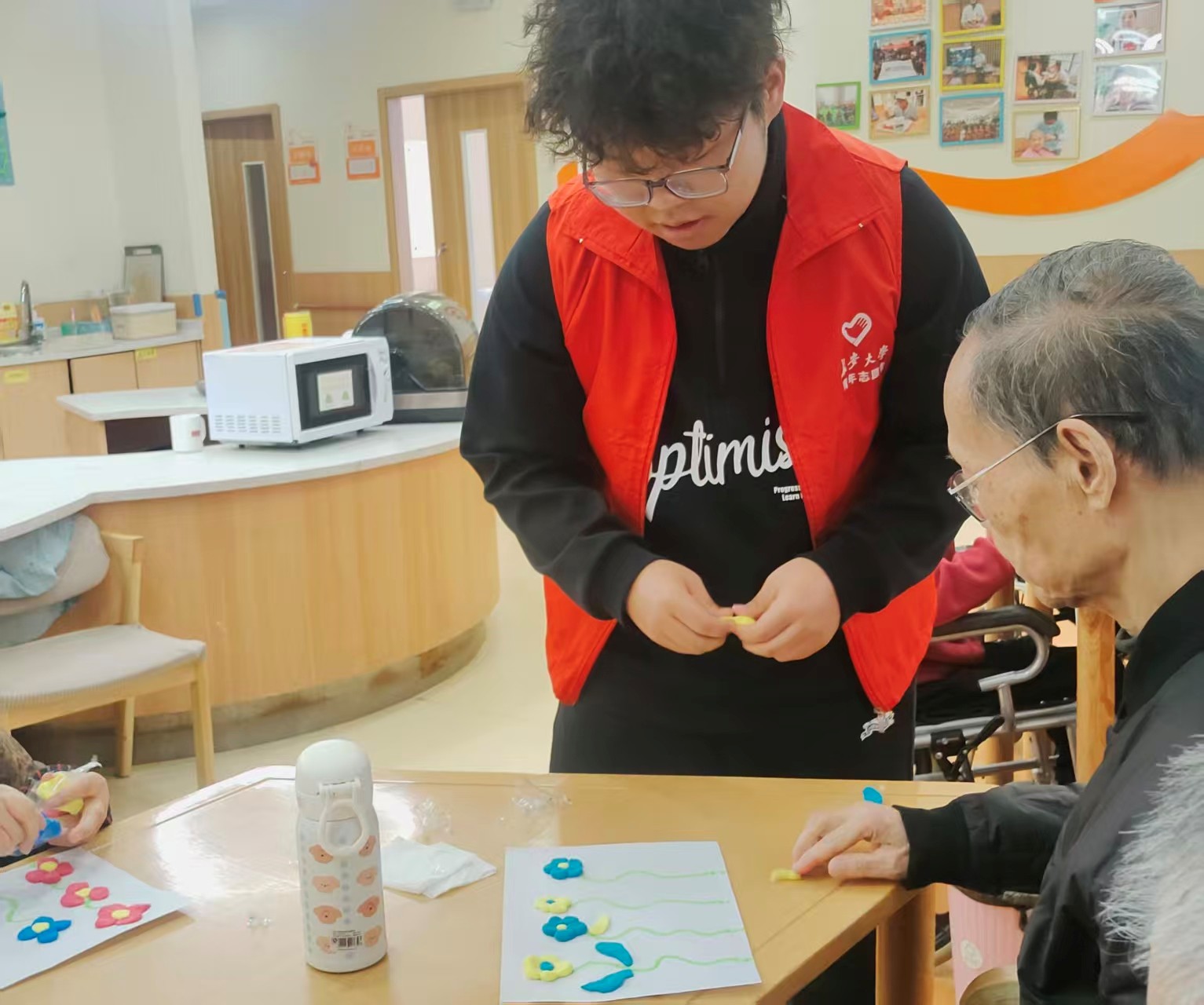 活动当天,志愿者们提前抵达北城长者屋,与现场护工和管理人员沟通对接,明确职责分工。清洁组的志愿者在护工引导下有序进入老人卧室,细致擦拭床头、桌椅,规整物品,为老人们营造整洁舒适的居住环境。与此同时,陪伴组的志愿者在活动室与老人们共同制作粘土花朵等手工作品。大家耐心指导制作,亲切交流互动,不仅丰富了老人的精神文化生活,更拉近了彼此的距离。