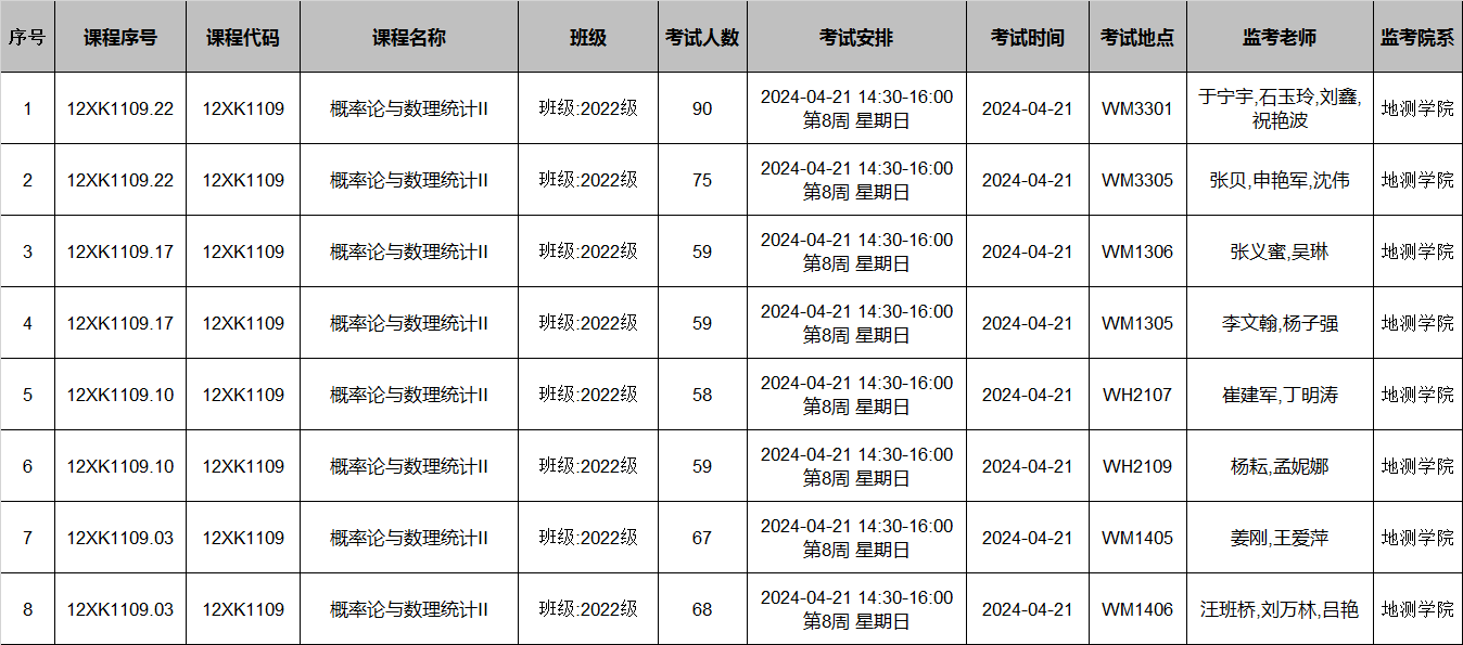 2023-2024-2学期概率论与数理统计期中考试安排已发布,监考安排学院已经在本科教务系统中填报完成(监考教师可同时在本科教务系统中查看监考安排)。为确保考试平稳顺利进行,学院已将相关监考工作安排表格上传到附件中,请各位老师及时下载查阅,并按时完成监考工作。