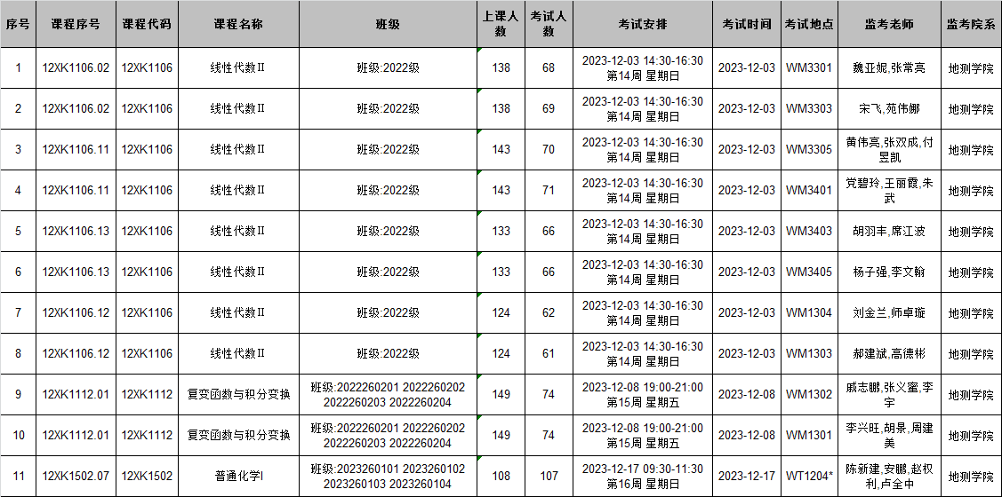 本学期线性代数、复变函数、普通化学I期末考试监考安排已发布,监考安排学院已经在本科教务系统中填报完成(监考教师可同时在本科教务系统中查看监考安排)。为确保考试平稳顺利进行,学院已将相关监考工作安排表格上传到附件中,请各位老师及时下载查阅,并按时完成监考工作。